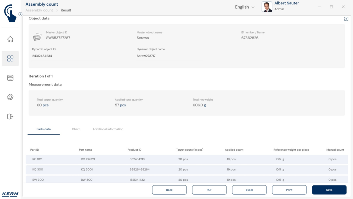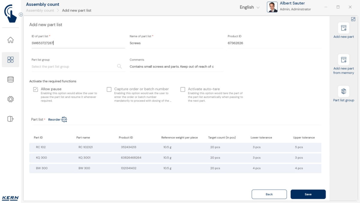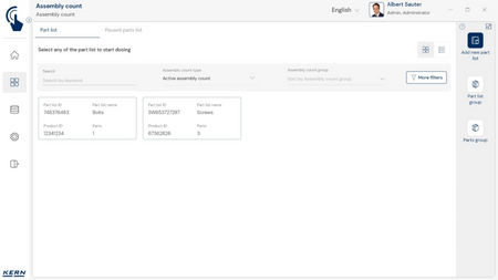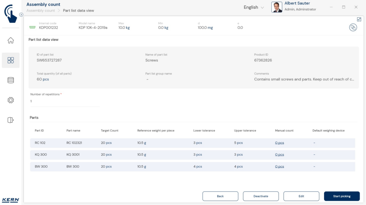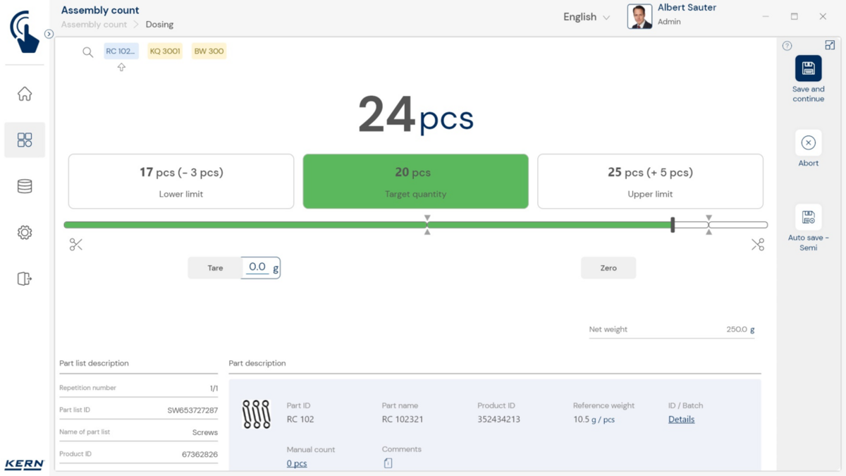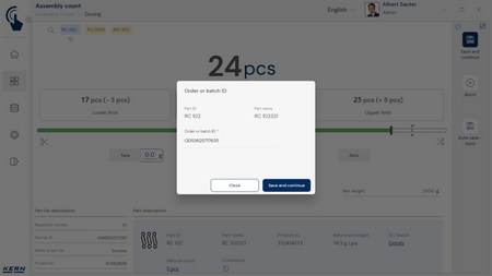 - Tarkvaras saab iga komponendi sihtkoguse koos lubatud tolerantsiga salvestada. Teadaoleva tükikaalu abil saab tarkvara koos kaaluga kiiresti kontrollida ka loendatud tükkide tegelikku arvu ja kuvada kõik vajalikud kogusekorrektsioonid.