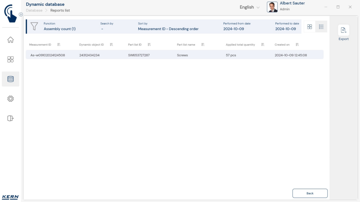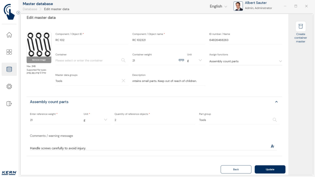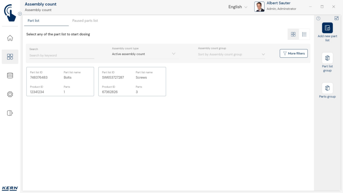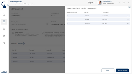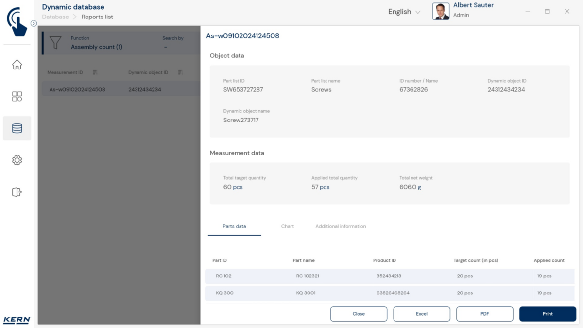 - Tarkvaras saab iga komponendi sihtkoguse koos lubatud tolerantsiga salvestada. Teadaoleva tükikaalu abil saab tarkvara koos kaaluga kiiresti kontrollida ka loendatud tükkide tegelikku arvu ja kuvada kõik vajalikud kogusekorrektsioonid.