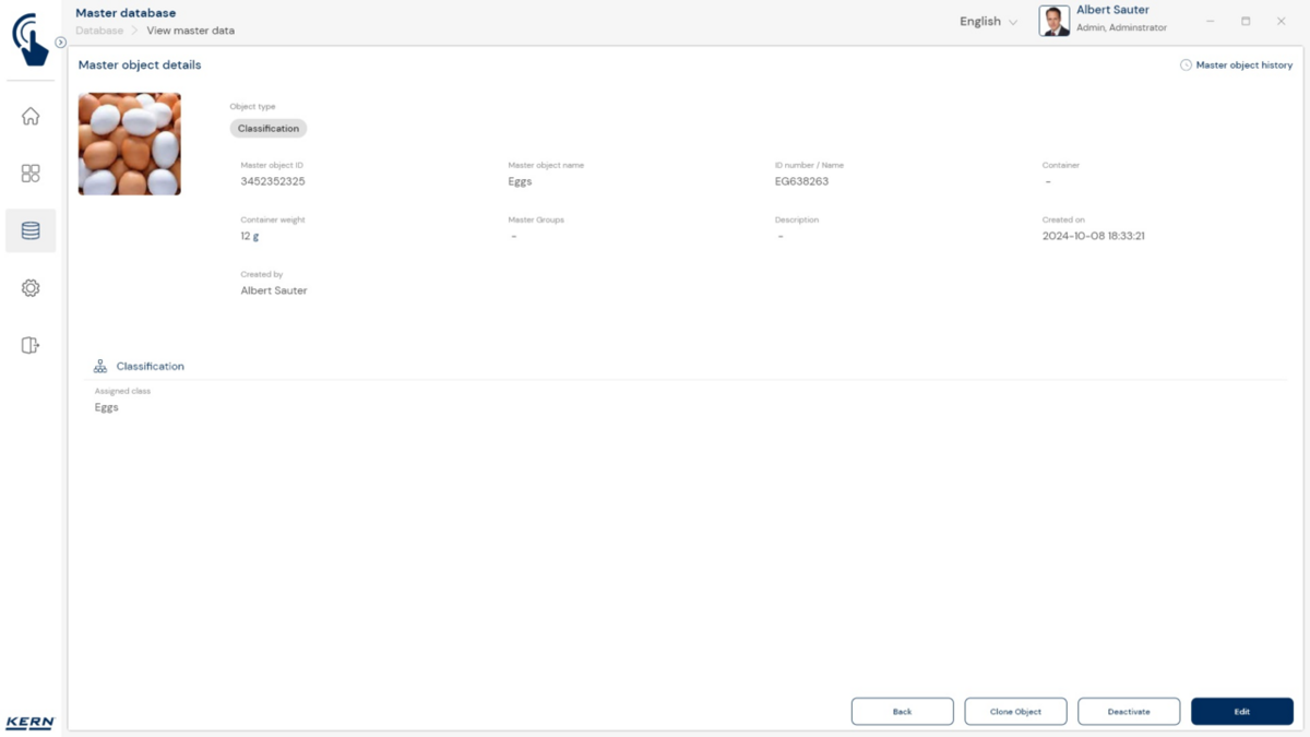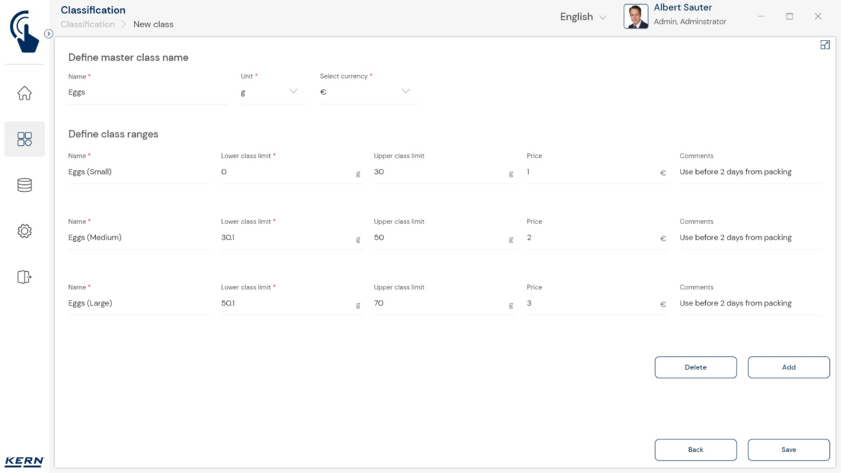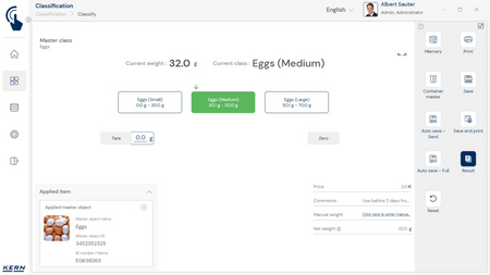 - Kesksed põhiandmed mälu : Klassifikatsiooniobjekte saab salvestada mälu süsteemist koos klassifikatsiooniprofiili, klassi nime, sobivate alumise ja ülemise tolerantsi väärtustega, vajadusel hinna ja kommentaariga olenevalt klassist, samuti ID-numbri ja ID-nime, pildi jms-ga. Sel viisil ei pea neid väärtusi pidevalt uuesti sisestama, vaid neid saab hõlpsalt süsteemist esile kutsuda. mälu. Põhiandmetes mälu Samuti saate salvestada tüüpilise pakendi, kasti või konteineri võimaliku taara väärtuse, mis seejärel kaalumistulemusest automaatselt maha arvatakse (PreTare)