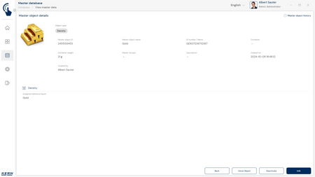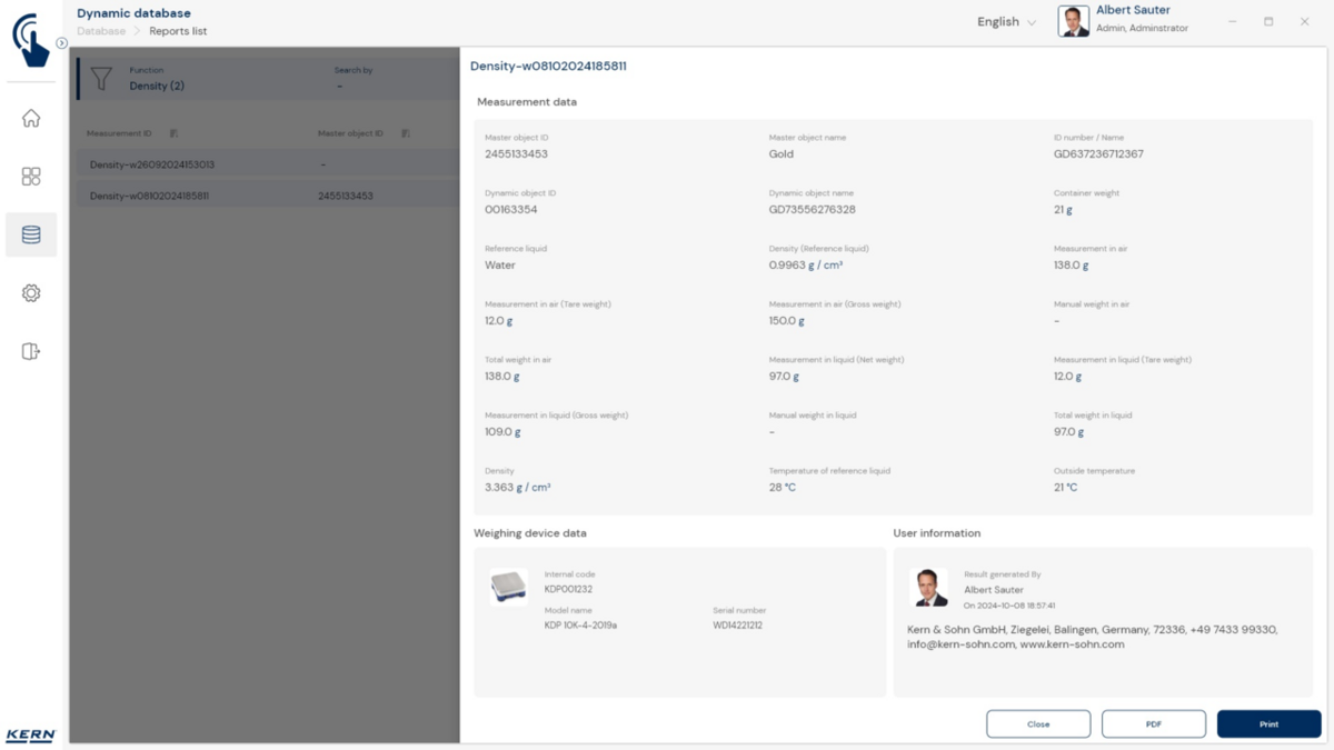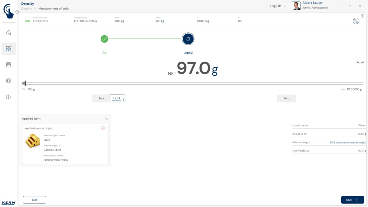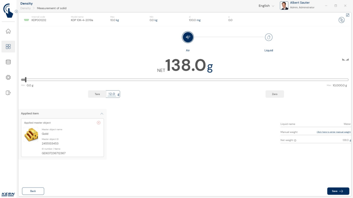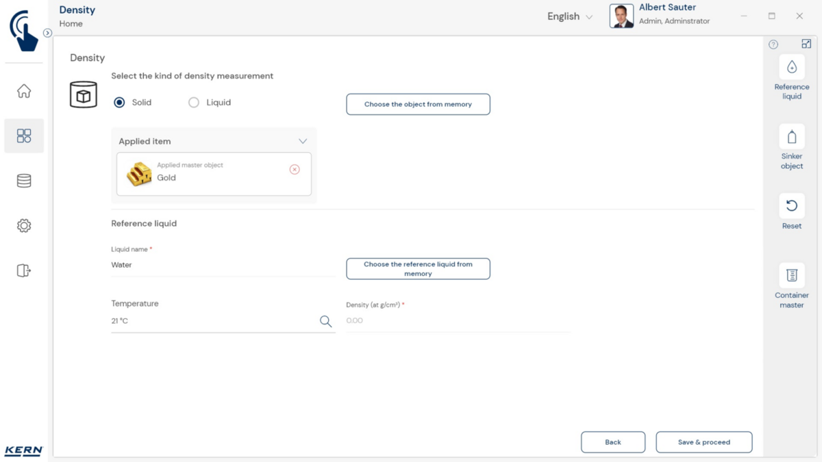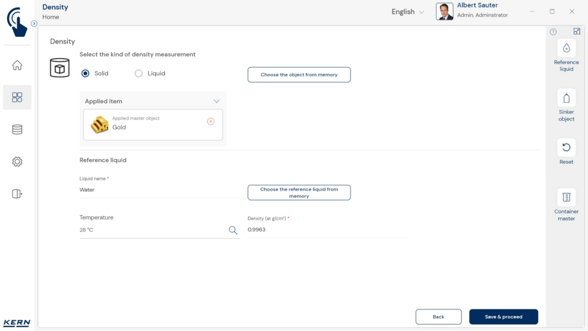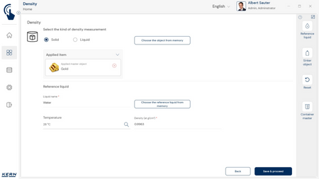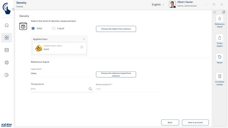 - Juhendamine läbi tiheduse määramine Tahkete ainete ja vedelike analüüs on eriti kasutajasõbralik ja kasutab graafikat, tihedus arvutatakse ja väljastatakse kohe