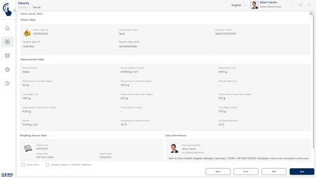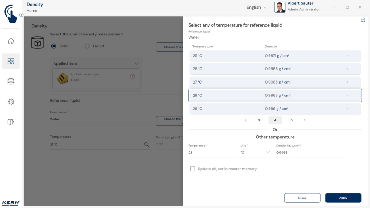 - Tahkete ainete tiheduse määramine ujuvuse abil: Samuti on võimalik valida eelnevalt määratletud vedelaid keskkondi, samuti määratleda üksikud vedelad keskkonnad koos nende eritihedusega kindlal temperatuuril. See tähendab, et üksikuid vedelaid keskkondi saab üksikutel temperatuuridel koos nende eritiheduse väärtustega liita.