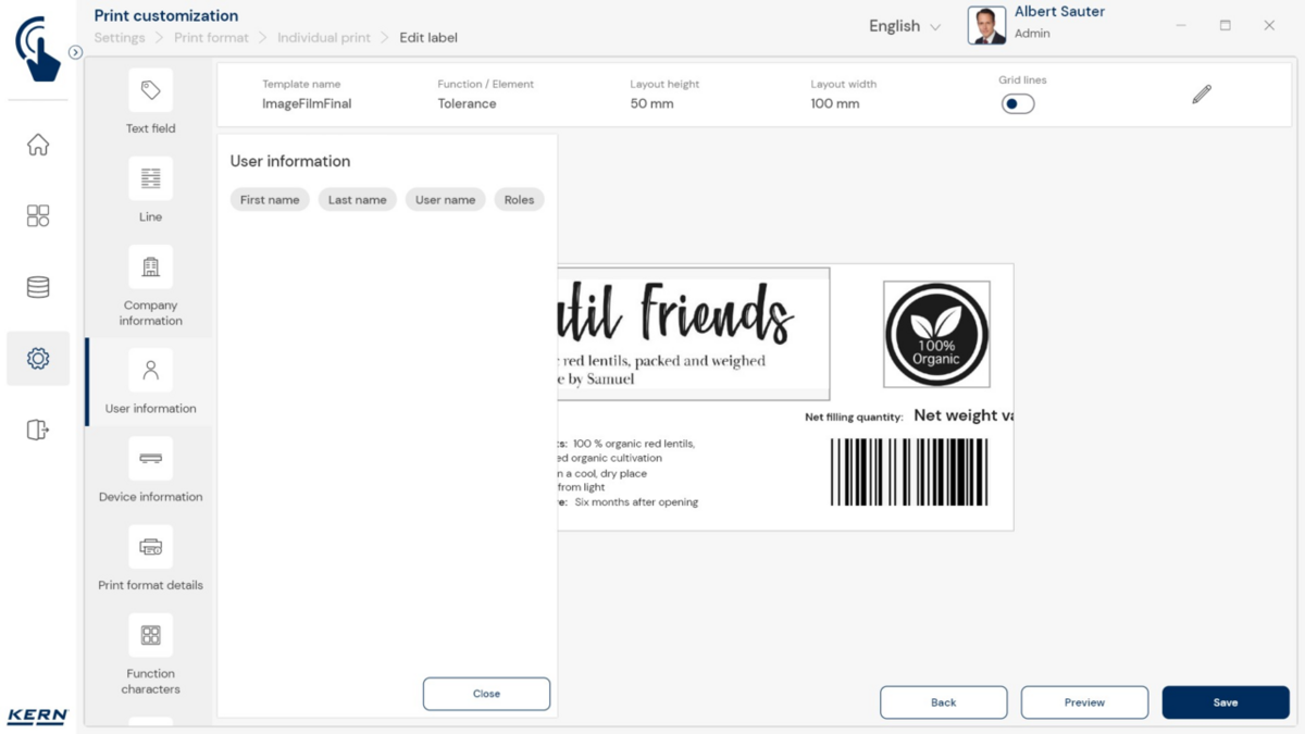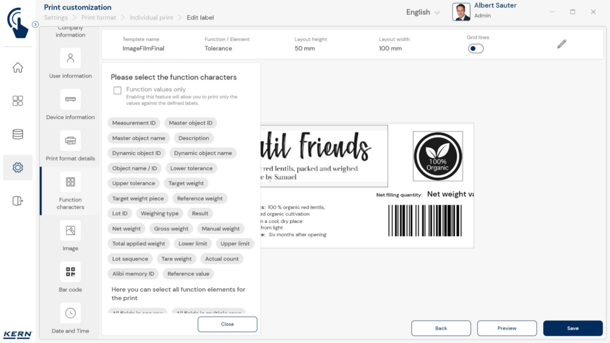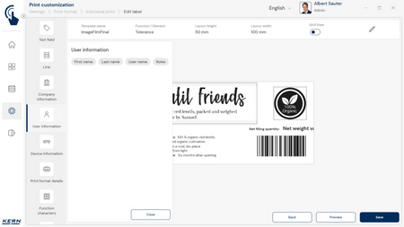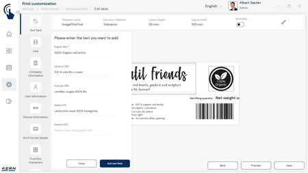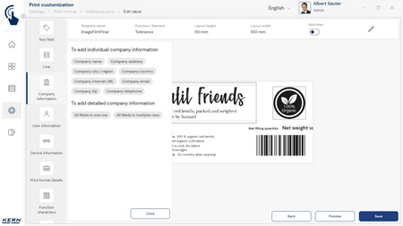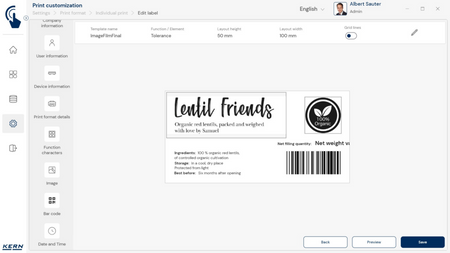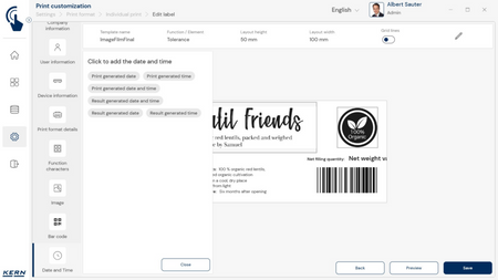 - Prinditud elementide individuaalne positsioneerimine: EasyTouch Individual Printi abil saate kujundada oma väljatrüki vastavalt oma vajadustele ja spetsifikatsioonidele. Paigutage teave, näiteks kaal, tükkide arv, hind, kasutaja ja/või kuupäev ja kellaaeg, täpselt nii, nagu soovite.