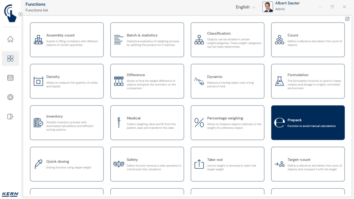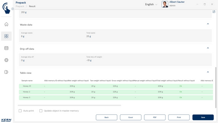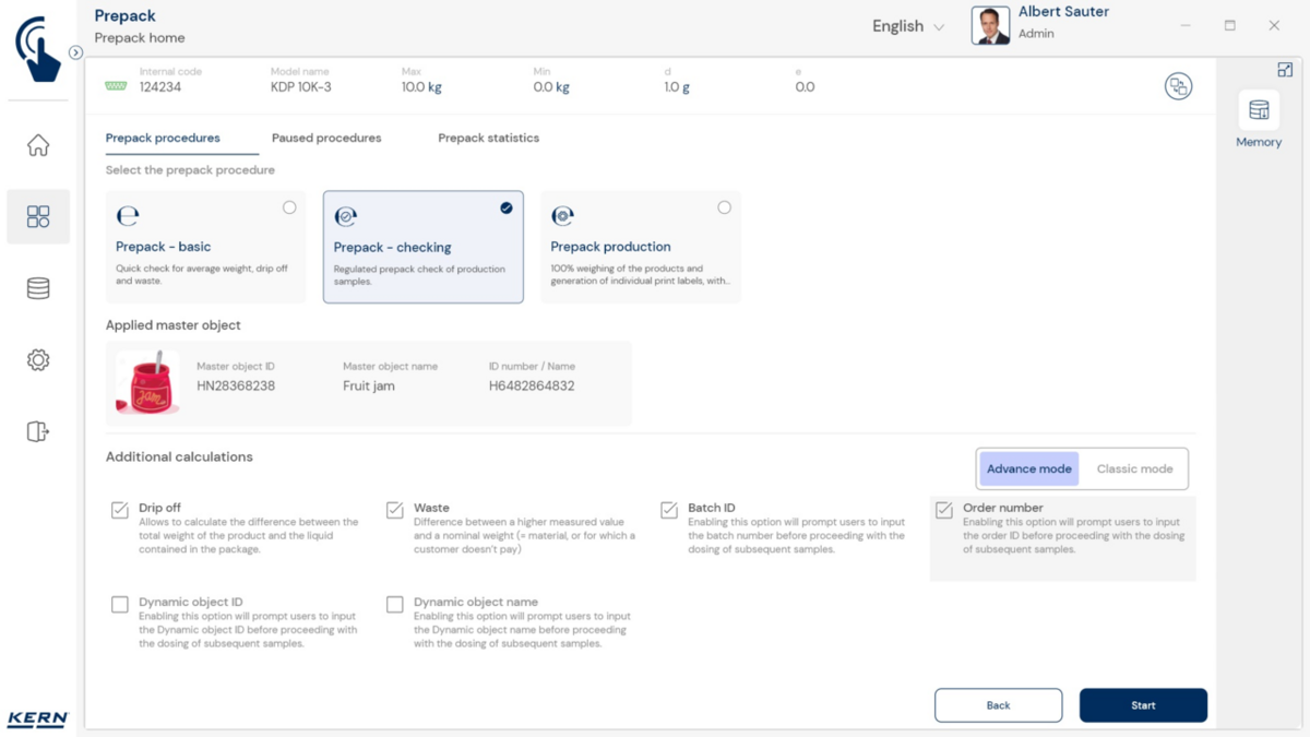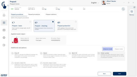- PrePack Basic: See funktsioon on mõeldud keskmise täitetaseme kiireks määramiseks. Muuhulgas saab seda kasutada täitmismasinate reguleerimiseks, et koguseid õigesti väljastada. Iga kaalutud eset saab registreerida eraldi, samuti saab registreerida ületäitmise (jäägid). Nõrutamisprotsesside puhul registreeritakse toiduainete nõrutatud kaal vedela keskkonnaga pakendites. See kehtib ka sügavkülmutatud toidu kohta.