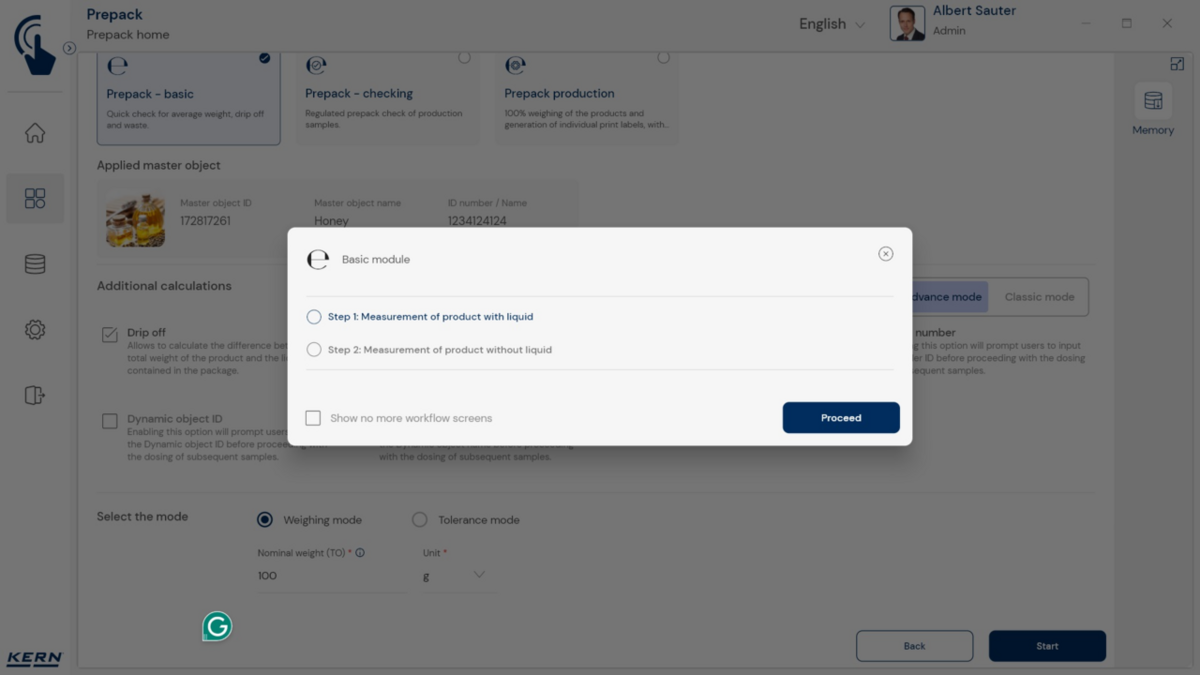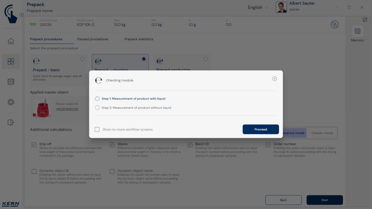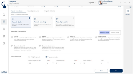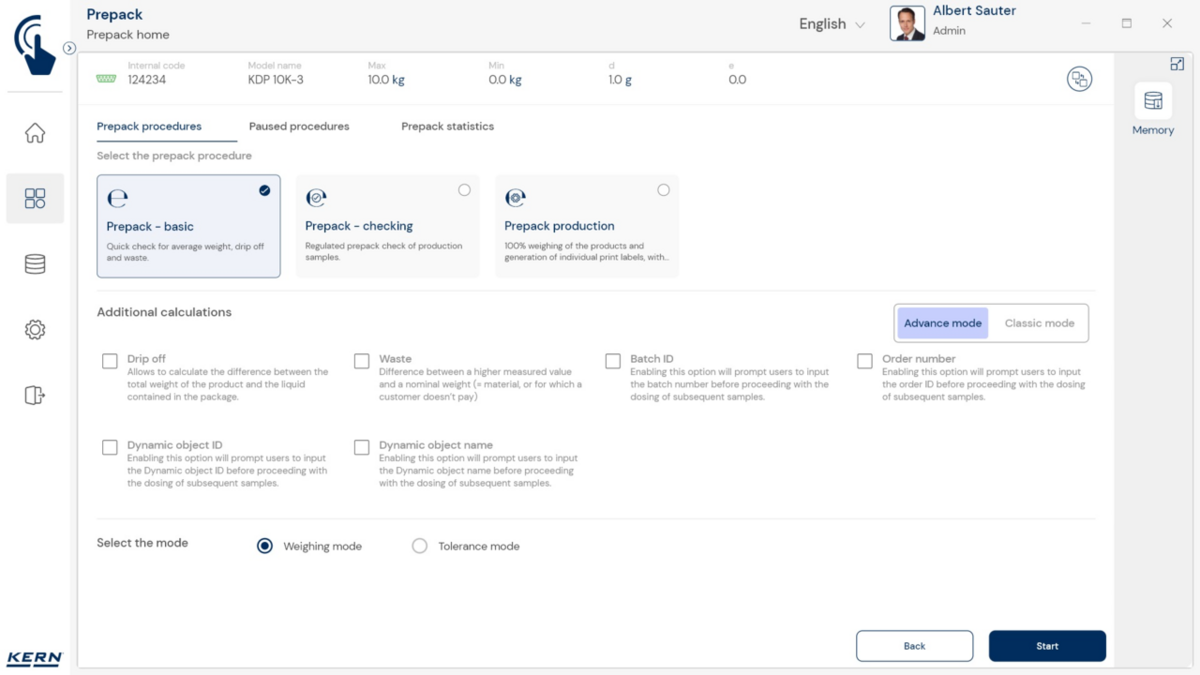 - Nn põhirežiim vähendab kasutajaliidese põhifunktsioonidele ja tagab lihtsa ning kasutajasõbraliku kasutamise. Põhirežiimi toimimisviis: Põhirežiimis valib kasutaja lihtsalt soovitud kauba, näiteks vöötkoodi skannides. Seejärel täidab süsteem automaatselt määratud funktsiooni, näiteks kaalumise, tükkide loendamise. tolerantsikontrollid või muud spetsiifilised protsessid. Seejärel andmed salvestatakse – ongi kõik. See automatiseeritud protseduur minimeerib veaallikaid ja optimeerib oluliselt töövoogu.