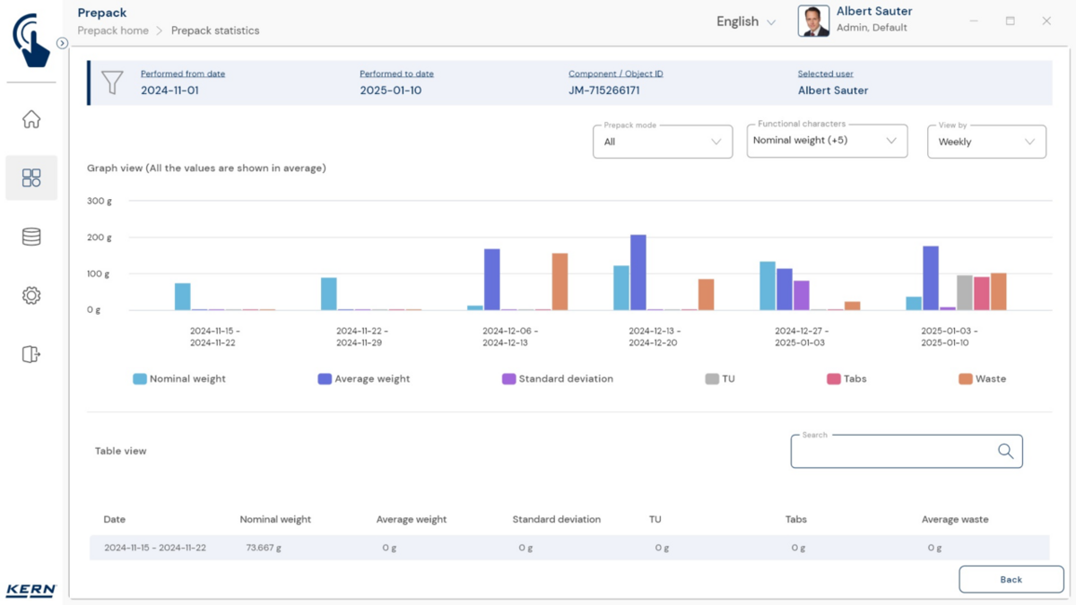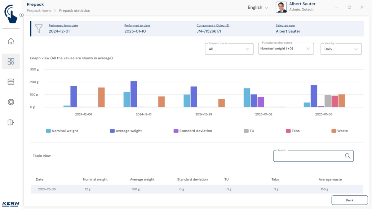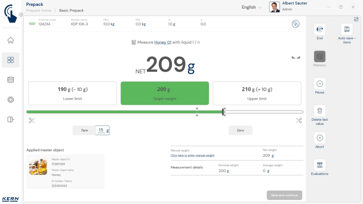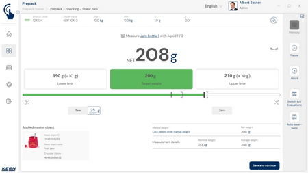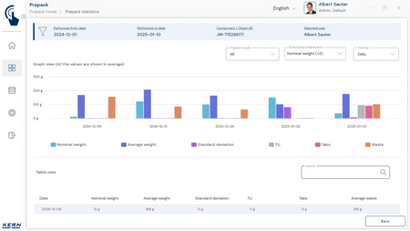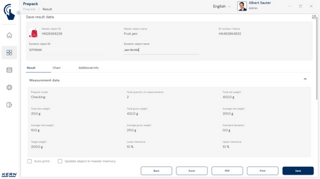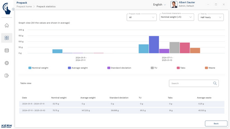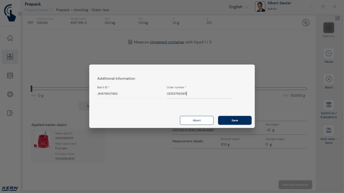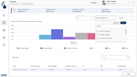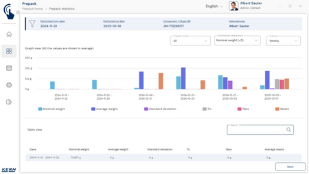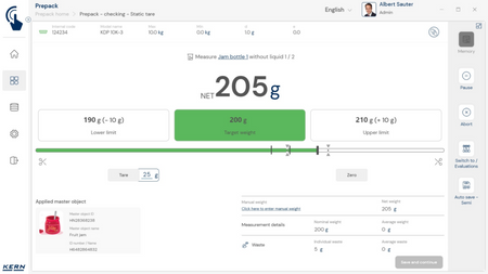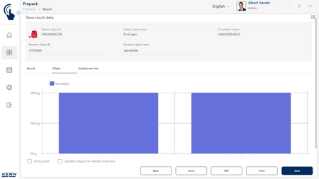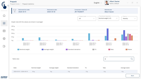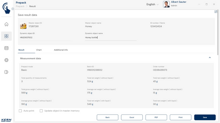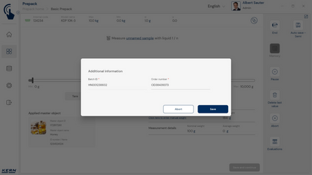 - Vastavushindamise läbinud kaalud: Nagu kõigi teiste EasyTouchi funktsioonide puhul, saab ka PrePacki kasutada taadeldud KERNi kaaludega (vastavushindamine vastavalt NAWID-ile, 2014/31/EL) sisseehitatud alibi abil. mälu . Alibi mälu Kaalu ID edastatakse tarkvarasse ja salvestatakse iga objekti mõõteandmetega võltsimiskindlalt. Kasutades seda mõõtmisega seotud Alibi ID-d tarkvaras, saab kontrollitud kaalu kaalul selgelt jälgida ja tõendada. mälu vajadusel