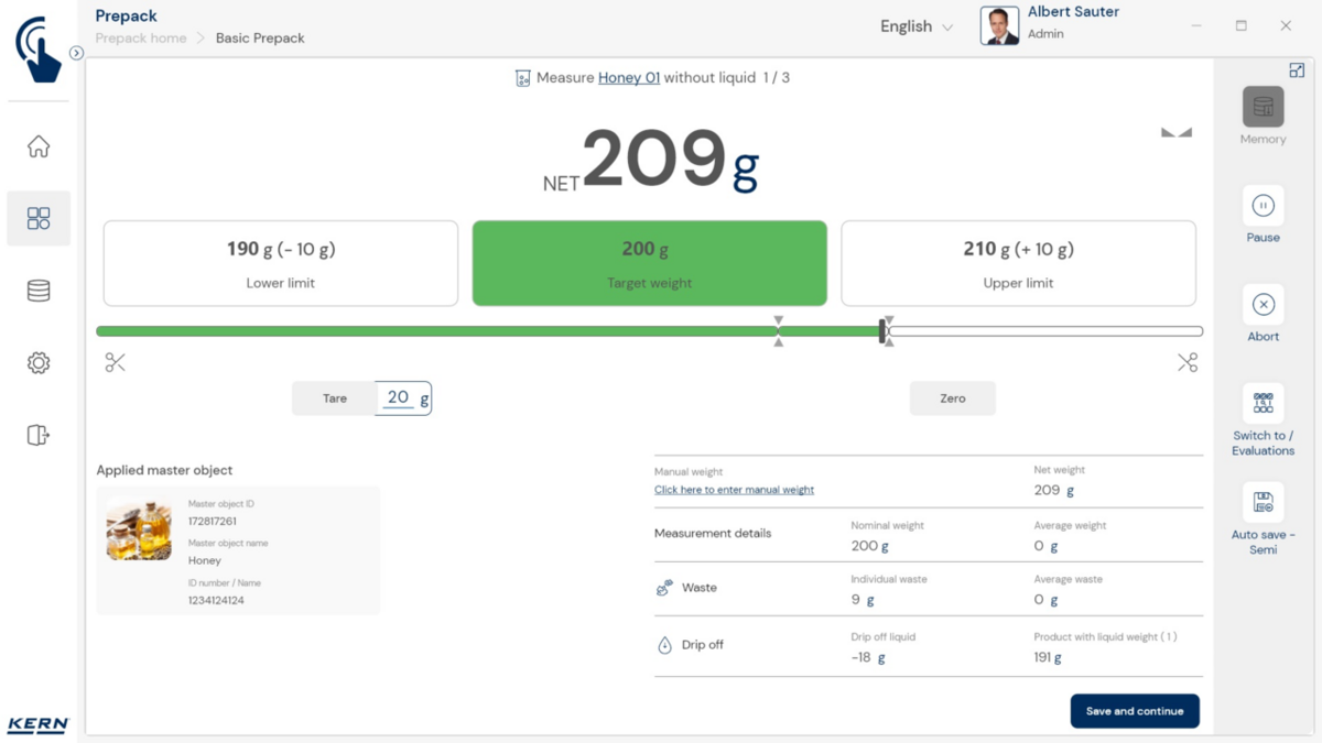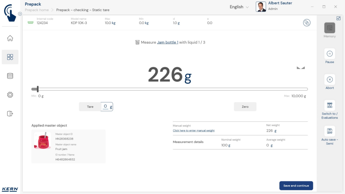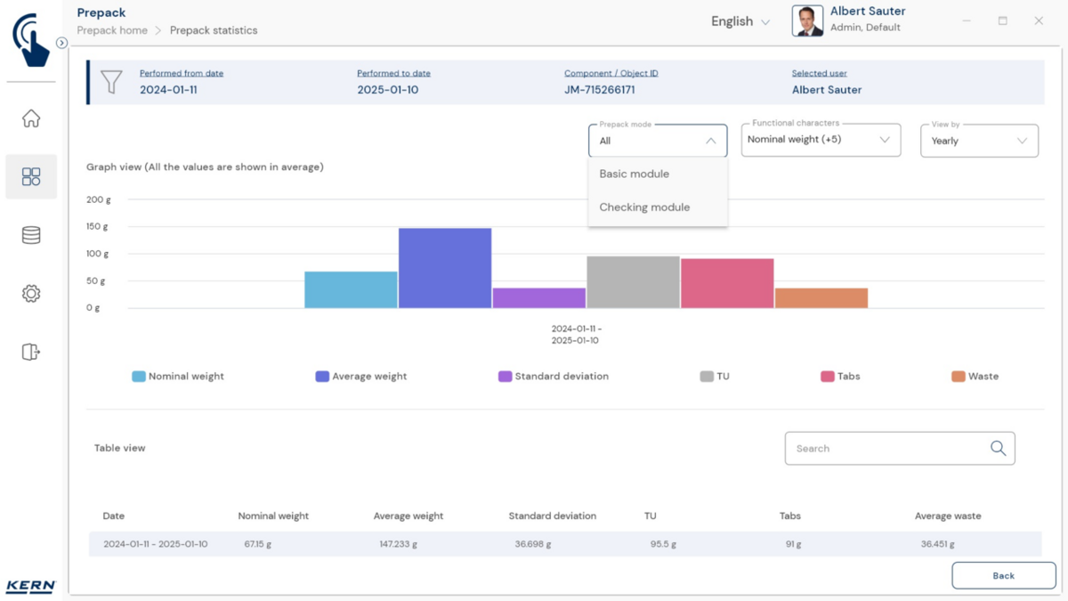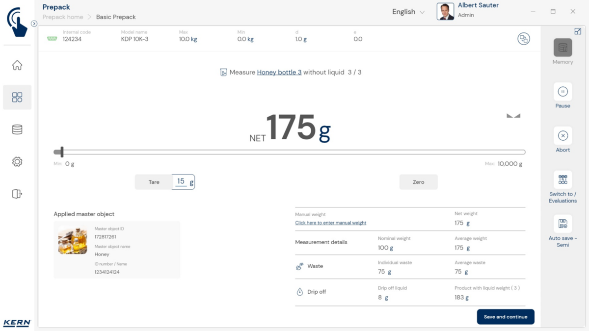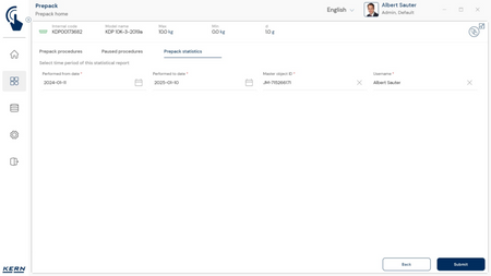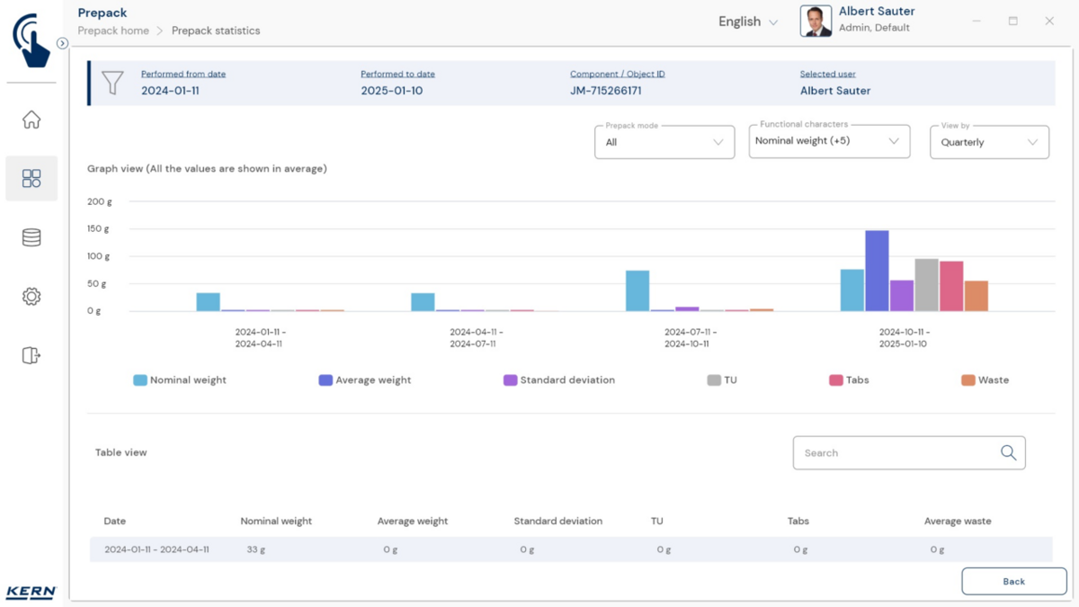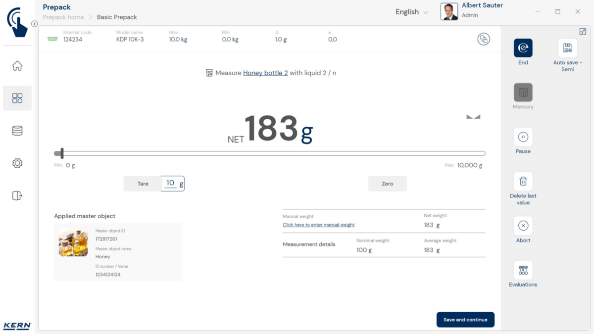 - Vastavushindamise läbinud kaalud: Nagu kõigi teiste EasyTouchi funktsioonide puhul, saab ka PrePacki kasutada taadeldud KERNi kaaludega (vastavushindamine vastavalt NAWID-ile, 2014/31/EL) sisseehitatud alibi abil. mälu . Alibi mälu Kaalu ID edastatakse tarkvarasse ja salvestatakse iga objekti mõõteandmetega võltsimiskindlalt. Kasutades seda mõõtmisega seotud Alibi ID-d tarkvaras, saab kontrollitud kaalu kaalul selgelt jälgida ja tõendada. mälu vajadusel
