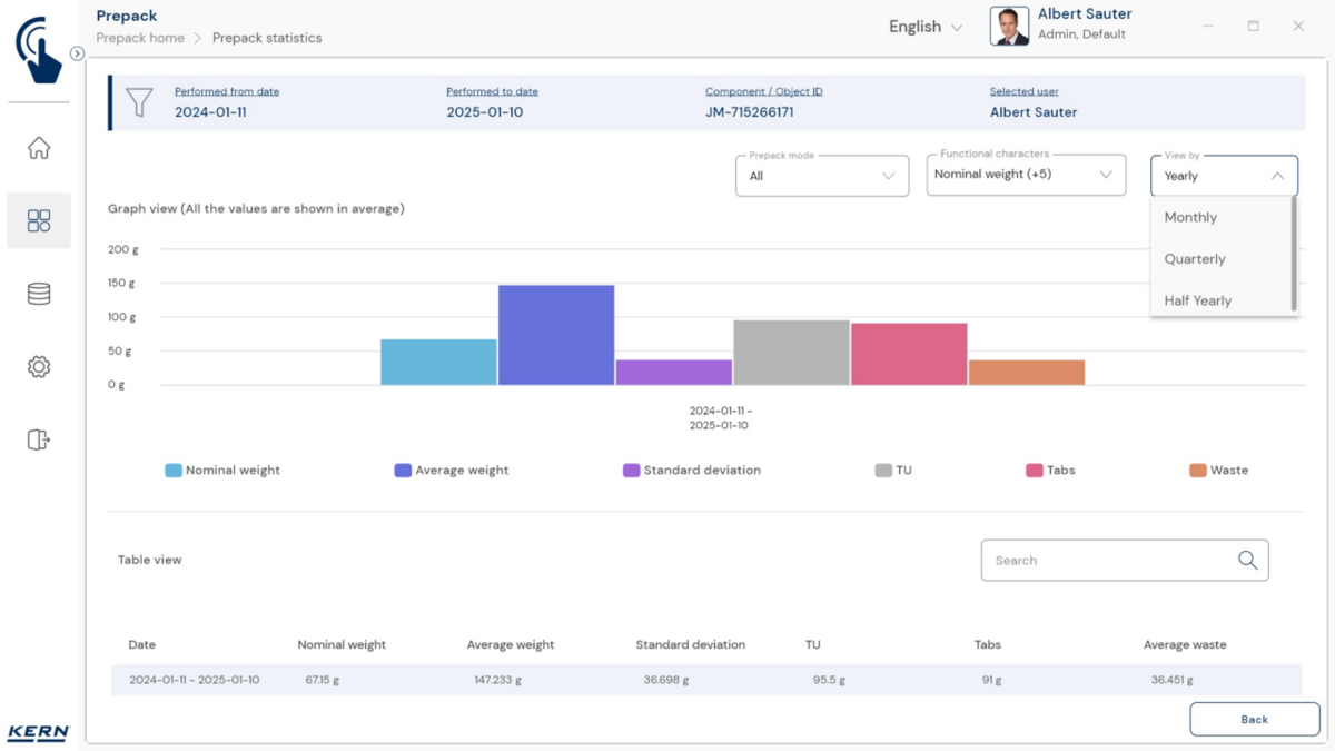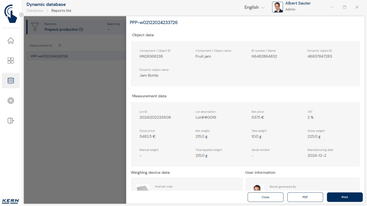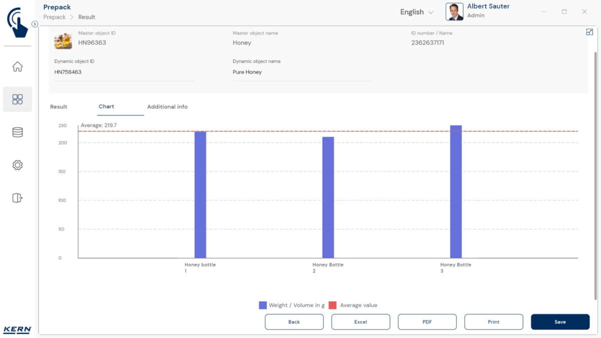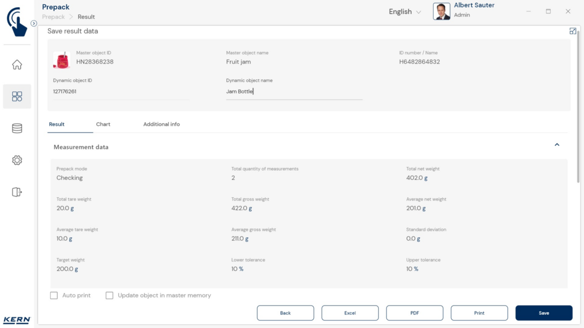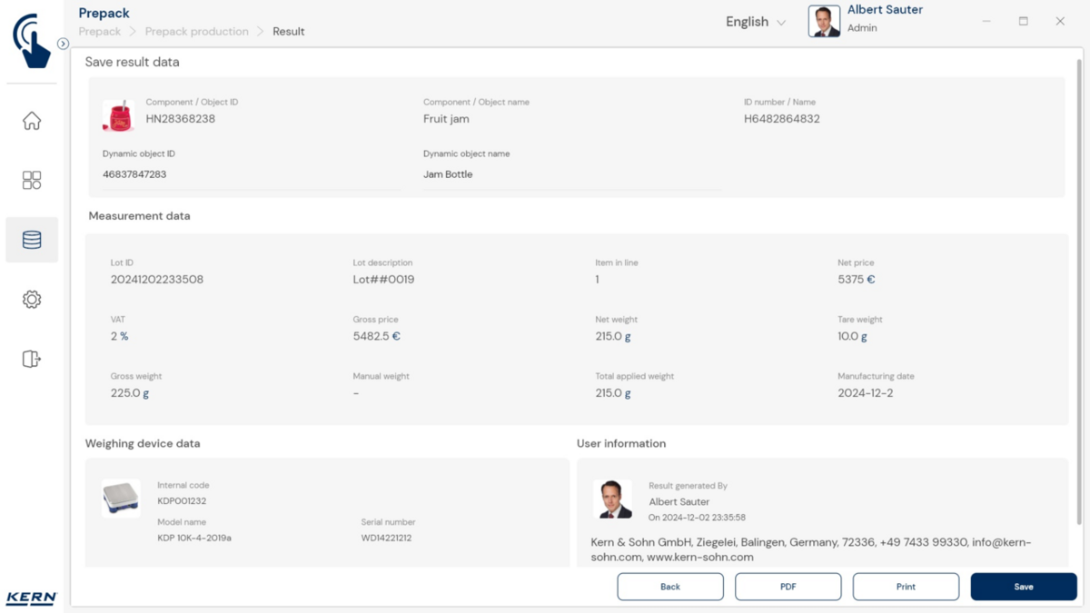 - Vastavushindamise läbinud kaalud: Nagu kõigi teiste EasyTouchi funktsioonide puhul, saab ka PrePacki kasutada taadeldud KERNi kaaludega (vastavushindamine vastavalt NAWID-ile, 2014/31/EL) sisseehitatud alibi abil. mälu . Alibi mälu Kaalu ID edastatakse tarkvarasse ja salvestatakse iga objekti mõõteandmetega võltsimiskindlalt. Kasutades seda mõõtmisega seotud Alibi ID-d tarkvaras, saab kontrollitud kaalu kaalul selgelt jälgida ja tõendada. mälu vajadusel