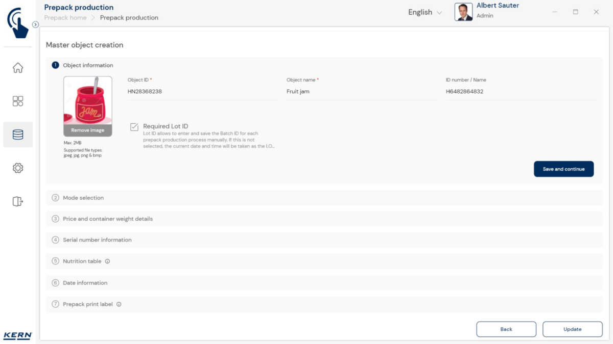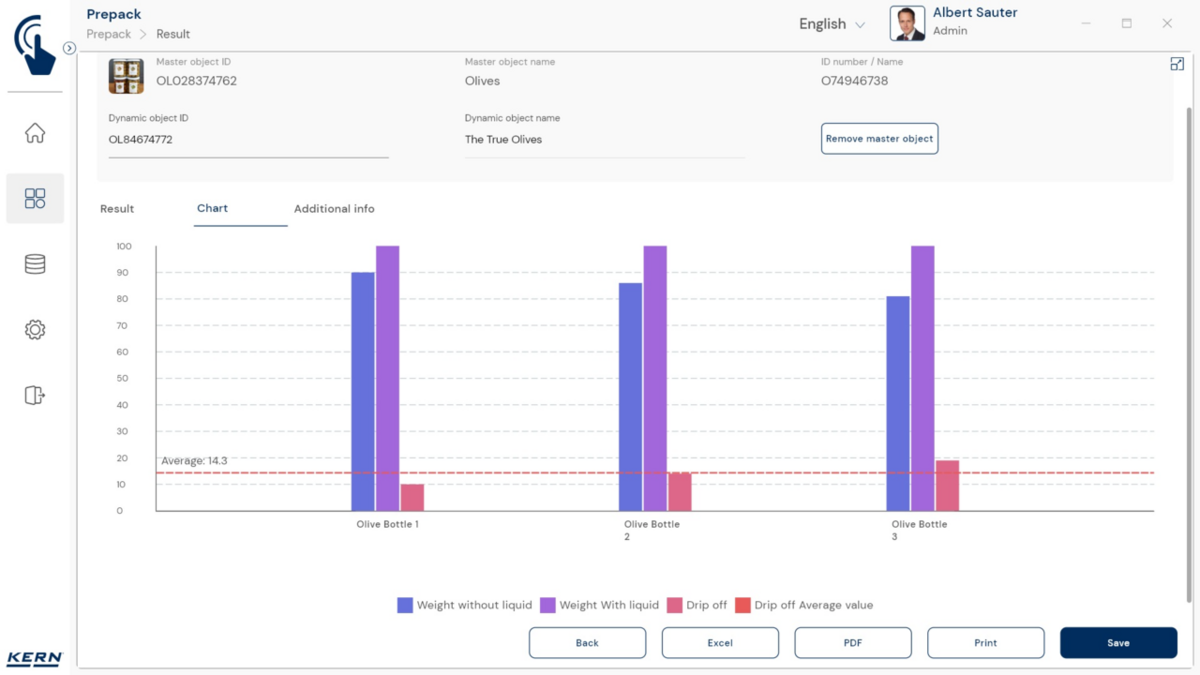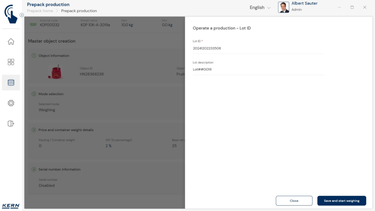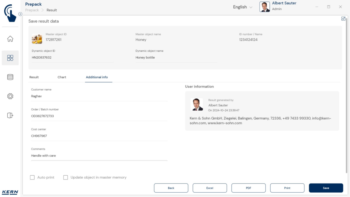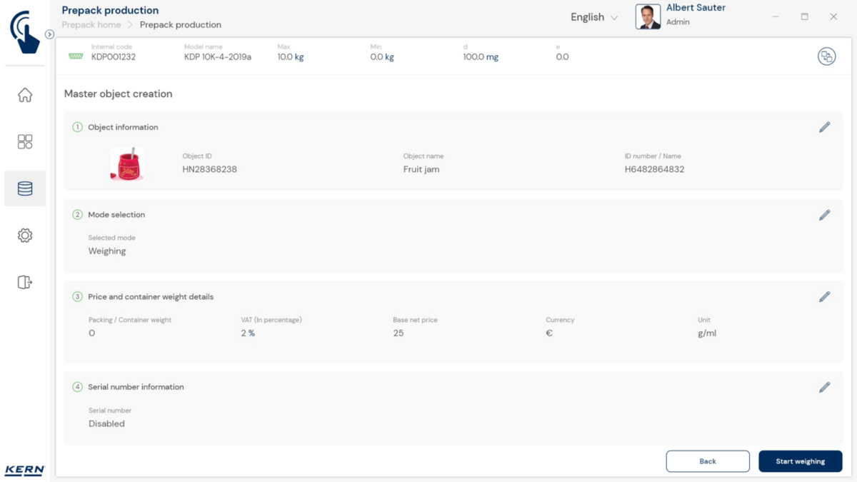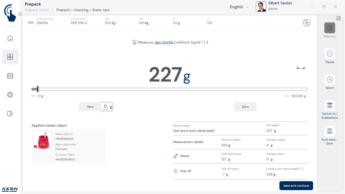 - Vastavushindamise läbinud kaalud: Nagu kõigi teiste EasyTouchi funktsioonide puhul, saab ka PrePacki kasutada taadeldud KERNi kaaludega (vastavushindamine vastavalt NAWID-ile, 2014/31/EL) sisseehitatud alibi abil. mälu . Alibi mälu Kaalu ID edastatakse tarkvarasse ja salvestatakse iga objekti mõõteandmetega võltsimiskindlalt. Kasutades seda mõõtmisega seotud Alibi ID-d tarkvaras, saab kontrollitud kaalu kaalul selgelt jälgida ja tõendada. mälu vajadusel