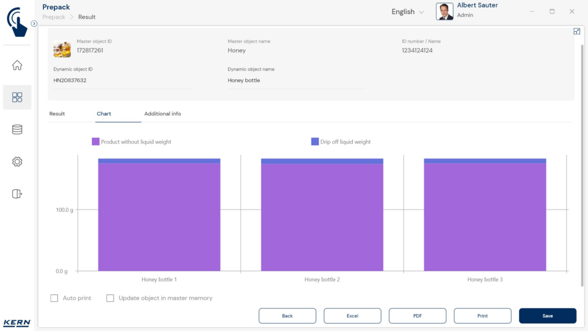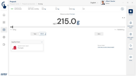 - Tõhus järjestus: Kõigi salvestatud põhiandmete ja automaatsete arvutuste (nt hindade) põhjal võimaldab PrePack Production ülitõhusat töövoogu: kasutaja asetab lihtsalt ühe pakitud toote teise järel kaalule. PrePack Production registreerib iga uue kaalumisobjekti automaatselt. Tarkvara registreerib automaatselt kaalu, teostab arvutused, käivitab etiketi printimise ja salvestab andmed võltsimiskindlasse mõõteandmete süsteemi. mälu