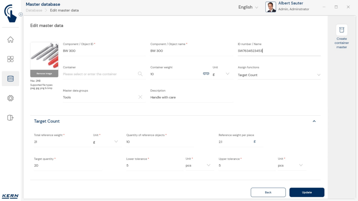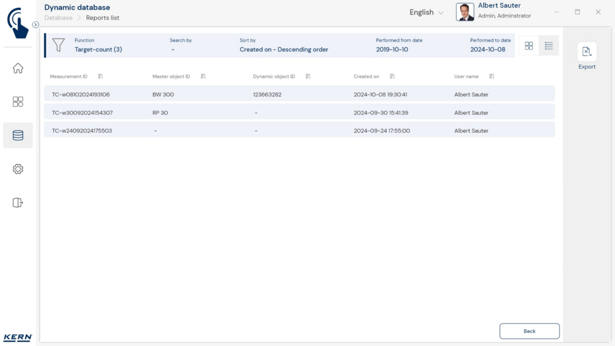 - Kesksed andmed mälu funktsioon Salvesta server (SET-10) kõigi mõõteandmete täiendavaks salvestamiseks kesksesse kohalikku serverikataloogi. Nii salvestatakse kõigi ühendatud EasyTouchi kaalumissüsteemide ja kõigi installitud EasyTouchi funktsioonide mõõteandmed. Selle funktsiooni eriline eelis mitme kaalumissüsteemiga kasutajatele on see, et kõik kaalumisandmed koondatakse ühte andmebaasi ja saate otsida individuaalseid mõõteandmeid mitmelt kaalult ühest tabelist. Salvesta serveri andmed mälu on ka võltsimiskindel ja seda ei saa muuta
