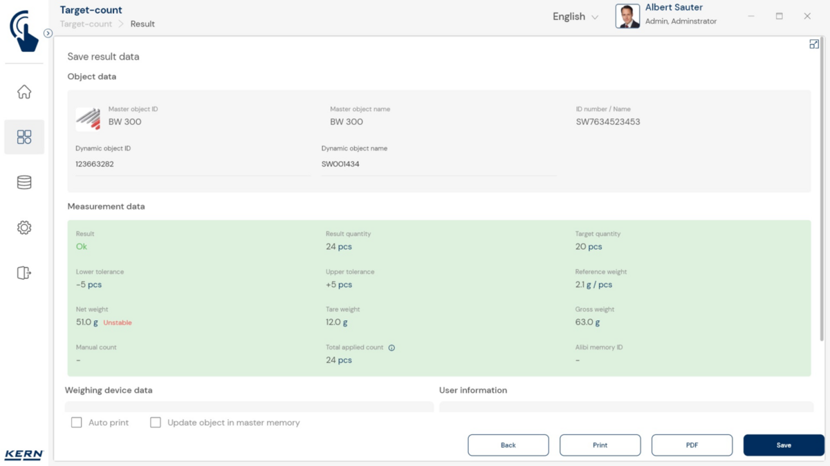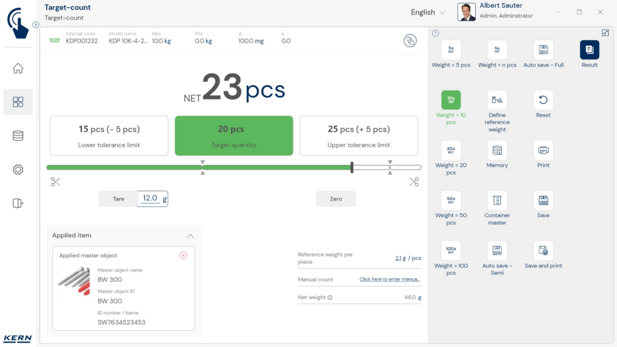 - Nn põhirežiim vähendab kasutajaliidese põhifunktsioonidele ja tagab lihtsa ning kasutajasõbraliku kasutamise. Põhirežiimi toimimisviis: Põhirežiimis valib kasutaja lihtsalt soovitud kauba, näiteks vöötkoodi skannides. Seejärel täidab süsteem automaatselt määratud funktsiooni, näiteks kaalumise, tükkide loendamise. tolerantsikontrollid või muud spetsiifilised protsessid. Seejärel andmed salvestatakse – ongi kõik. See automatiseeritud protseduur minimeerib veaallikaid ja optimeerib oluliselt töövoogu.