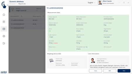 - ID-turvalisus: „ID-turvalisus” pakub võimalust salvestada iga kaalutud ja salvestatud klassifitseerimistulemus unikaalse ID-numbri (dünaamilise objekti ID) ja ID-nimega (dünaamilise objekti nimi), nt vöötkoodiskanneri abil. Salvestusprotsessi saab käivitada poolautomaatselt või täisautomaatselt ning alati pärast koorma kaalult maha võtmist ja uuesti pealekandmisel. See tähendab, et kasutaja ei pea masssalvestustoimingute jaoks ühtegi nuppu vajutama ja saab tõhusalt töötada.