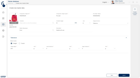 - Kesksed põhiandmed mälu : Kontrollkaalu objekte saab salvestada mälu süsteemist koos sihtkaalu ning alumise ja ülemise piiriga. Sel viisil ei pea neid piire pidevalt uuesti sisestama, vaid neid saab hõlpsalt menüüst esile kutsuda. mälu. Põhiandmetes mälu Samuti saate salvestada võimaliku taara väärtuse tüüpilise pakendi, kasti või konteineri jaoks, mida objekti jaoks tavaliselt kasutatakse, ja mis seejärel lahutatakse automaatselt kaalumistulemusest.
