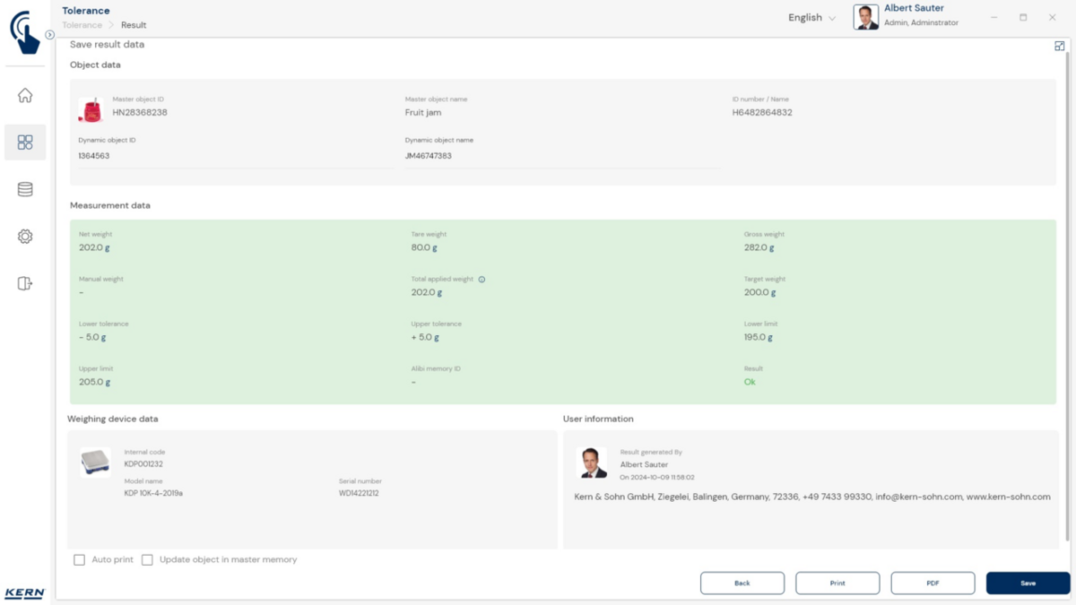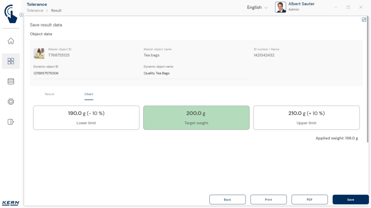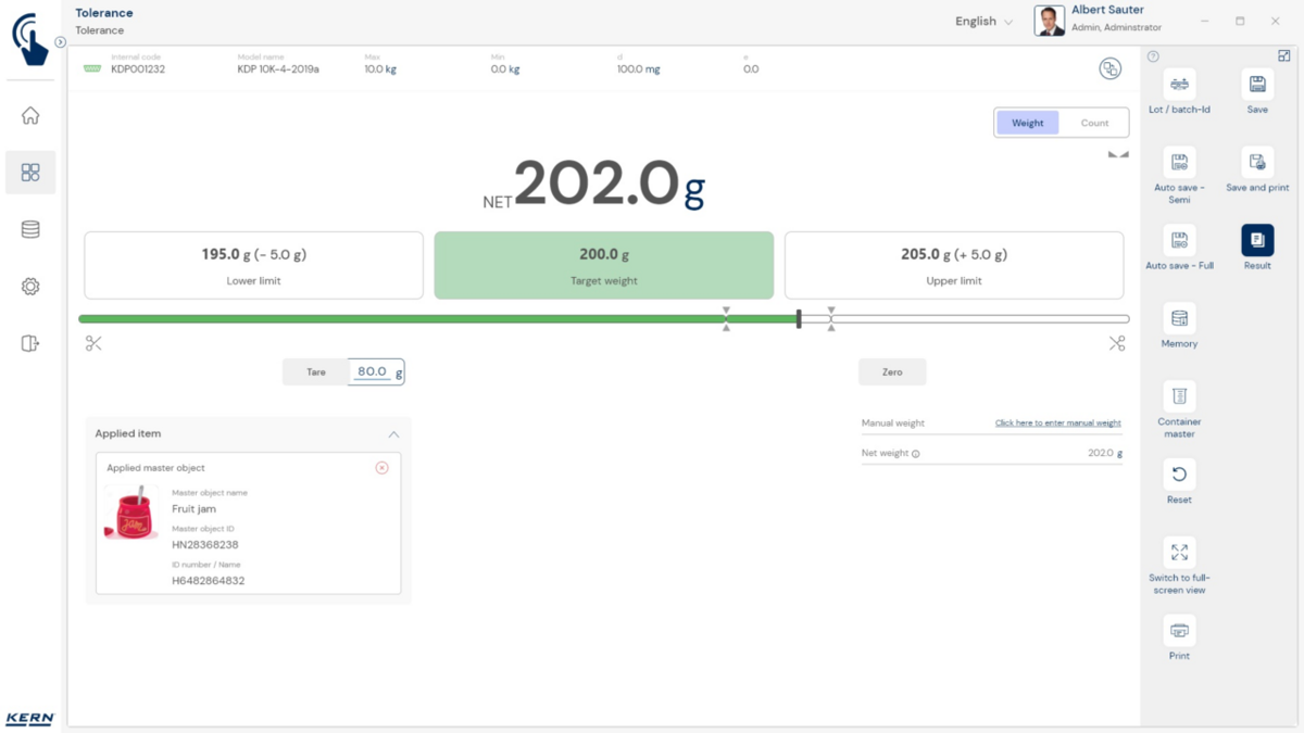 - Piirväärtusi saab puutetundliku ekraani või arvuti abil kiiresti ja lihtsalt sisestada. Selleks on kaks võimalust: kas määrata absoluutseks piiriks alumine või ülemine väärtus või määratleda sihtväärtus koos lubatud alumise ja ülemise hälbega. Lubatud hälbeid saab sisestada kas absoluutväärtusena „g“-des või suhtelise väärtusena „%“-des sihtväärtusest.