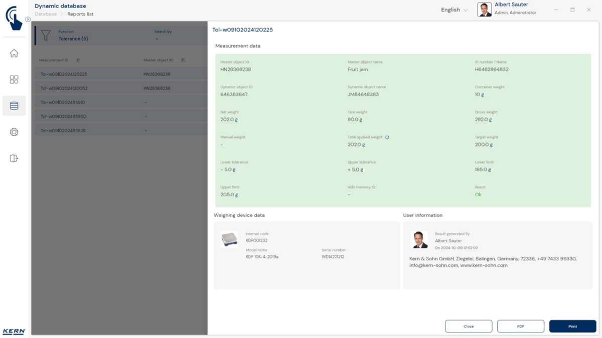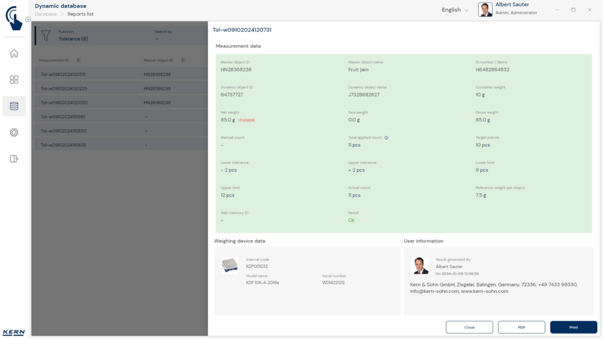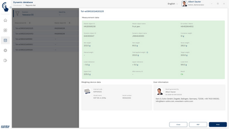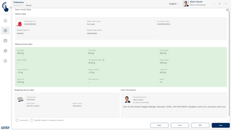 - ID-turvalisus: „ID-turvalisus” pakub võimalust salvestada iga kaalutud ja salvestatud klassifitseerimistulemus unikaalse ID-numbri (dünaamilise objekti ID) ja ID-nimega (dünaamilise objekti nimi), nt vöötkoodiskanneri abil. Salvestusprotsessi saab käivitada poolautomaatselt või täisautomaatselt ning alati pärast koorma kaalult maha võtmist ja uuesti pealekandmisel. See tähendab, et kasutaja ei pea masssalvestustoimingute jaoks ühtegi nuppu vajutama ja saab tõhusalt töötada.