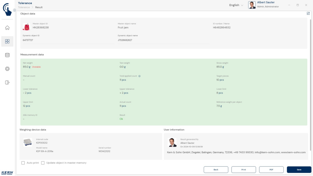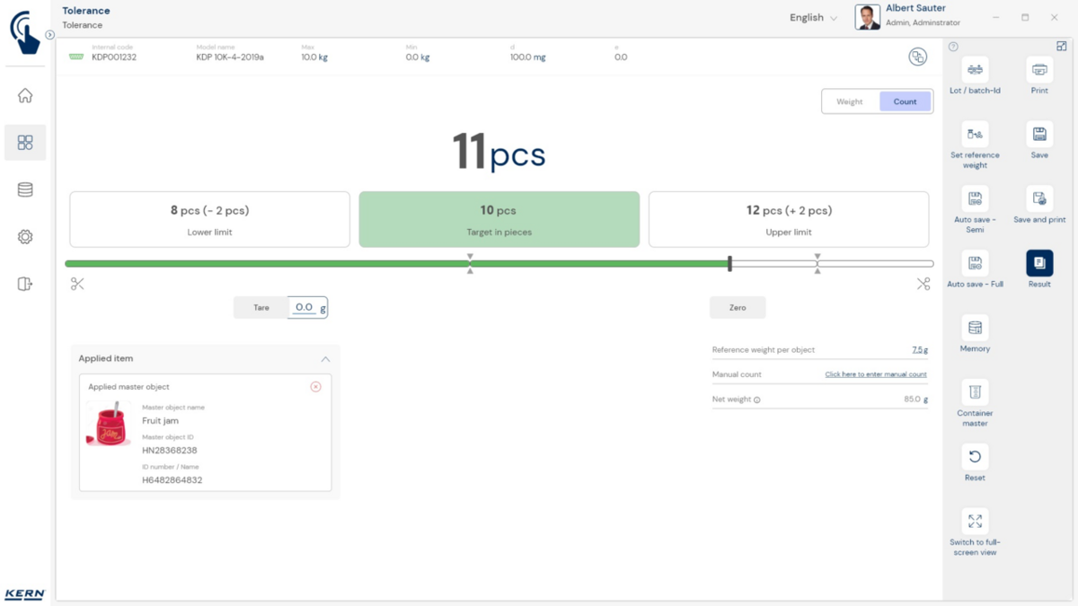 - Tolerantsifunktsioon tükkides: Kontrollkaalumise funktsiooni saab teostada grammides, kilogrammides või alternatiivselt tükkides. Selleks saate sisestada loendatava objekti individuaalse kaalu (võrdluskaal), sihtühikute arvu ning ühikute arvu ülemise ja alumise piirväärtuse.
